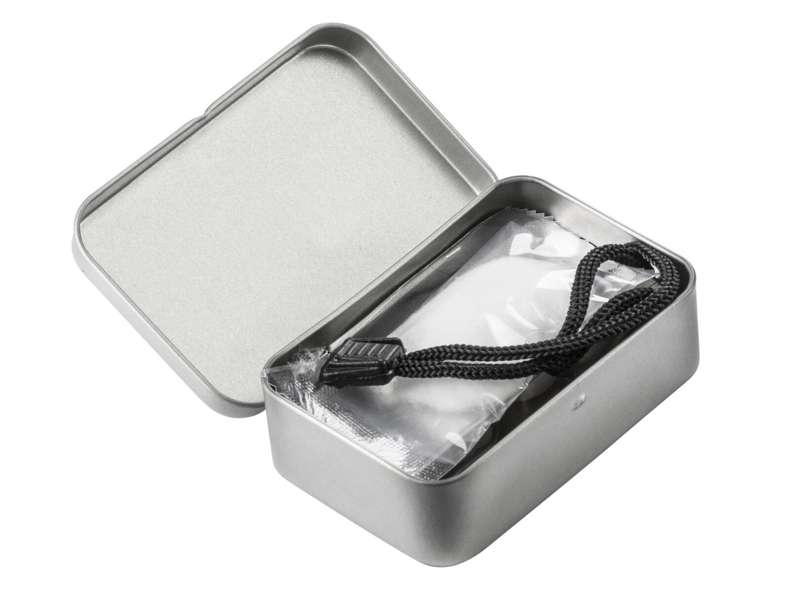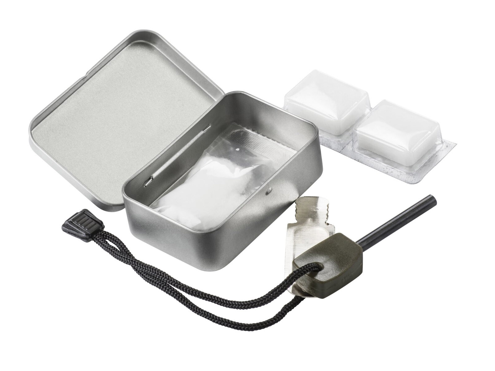 - metalowe pudełko — zabezpiecza zawartość i może służyć jako pojemnik na dodatkowy rozpał lub inne drobiazgi.