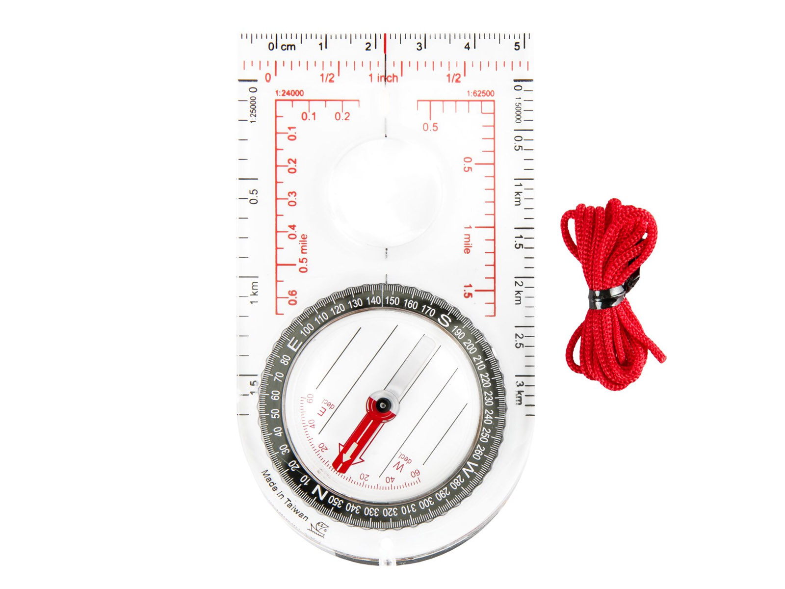 Kompas wypełniono płynem, co znacząco poprawia stabilność i dokładność odczytów w różnych warunkach. Ruchomy limbus wyskalowany co 1° pozwala na precyzyjne ustalanie azymutu, a cztery skale mapowe oraz linijki w centymetrach i calach ułatwiają orientację w terenie i szybkie przeliczanie odległości.