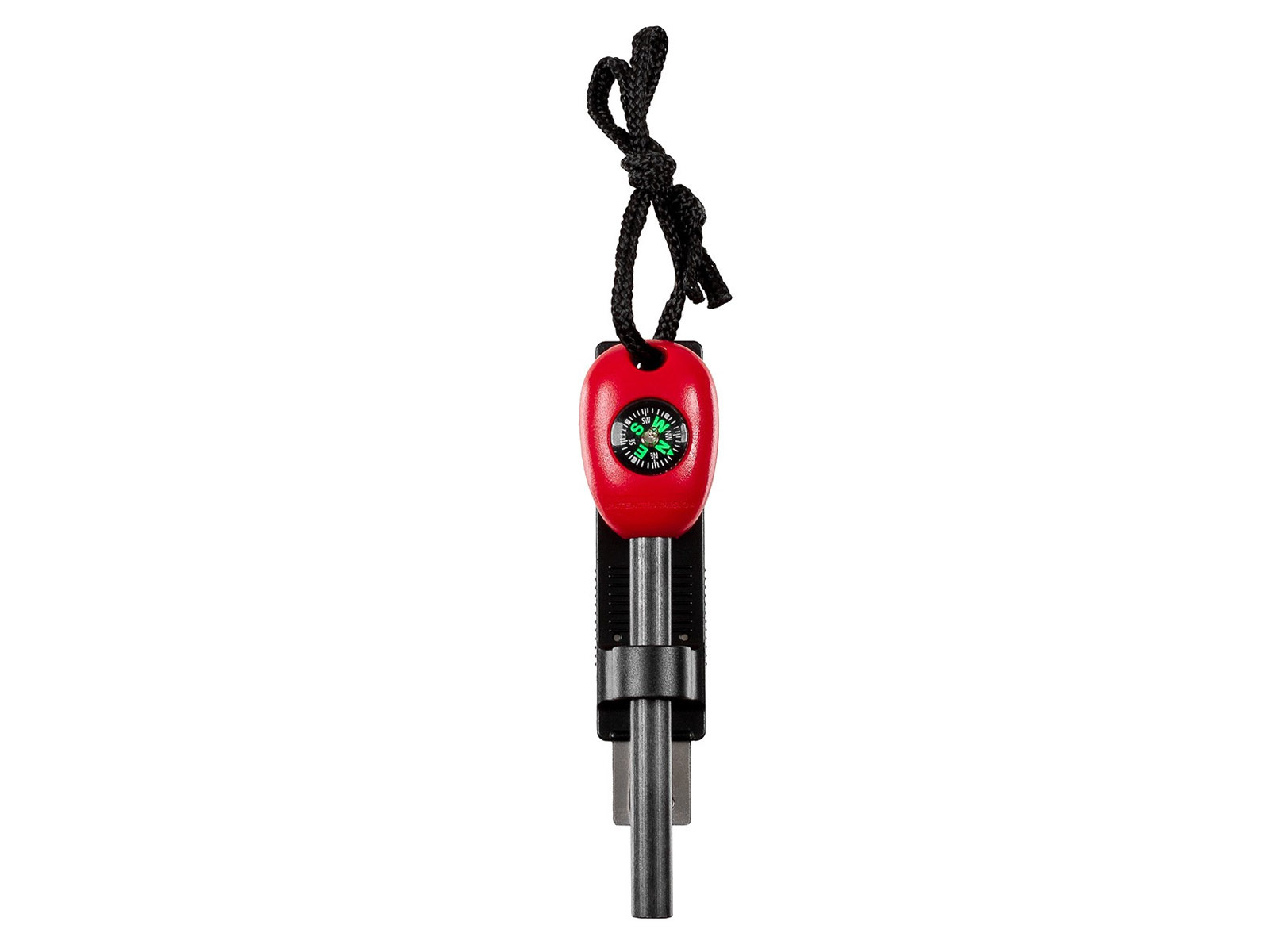 W chwycie krzesiwa znajduje się zintegrowany, wypełniony cieczą kompas guzikowy, który może posłużyć jako awaryjne narzędzie orientacyjne w terenie. Obudowa w kolorze czerwonym poprawia widoczność i ułatwia odnalezienie krzesiwa w ciemności lub trudnych warunkach.