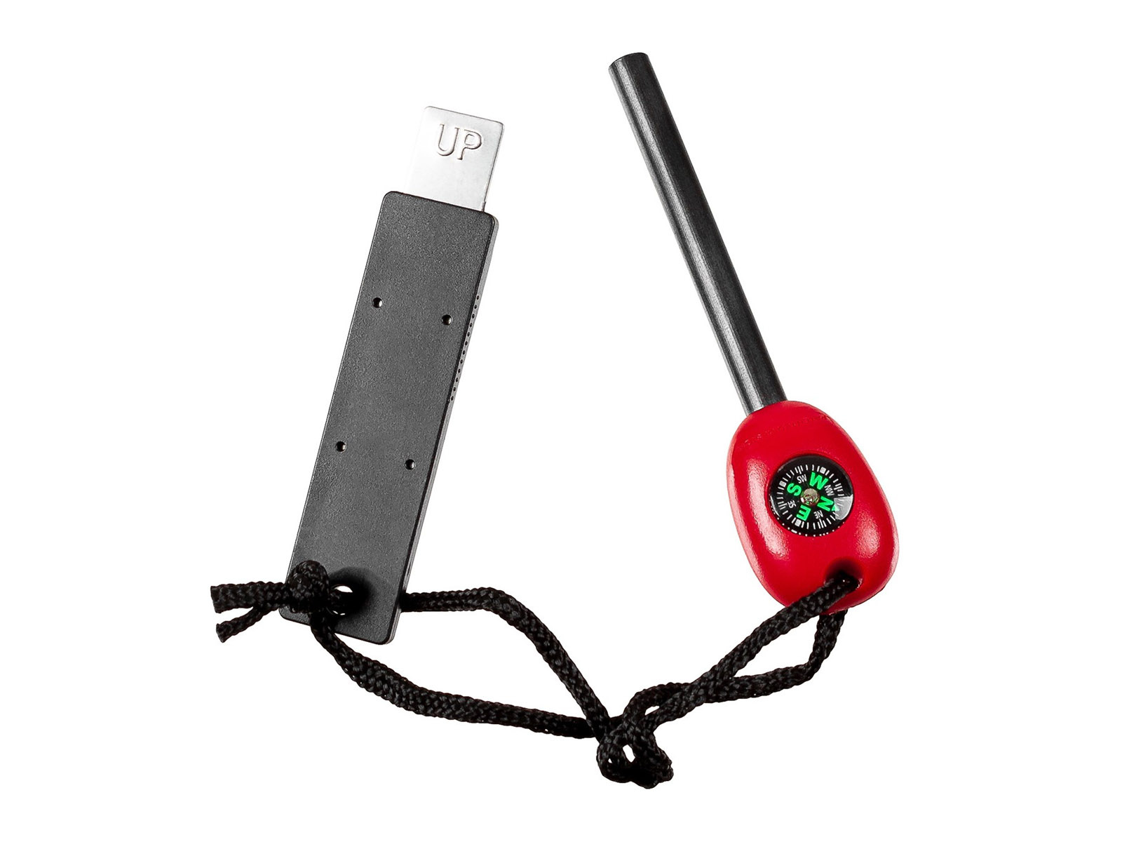 - Kompaktowa, 2-częściowa konstrukcja – krzesiwo + iskrownik na sznurku,