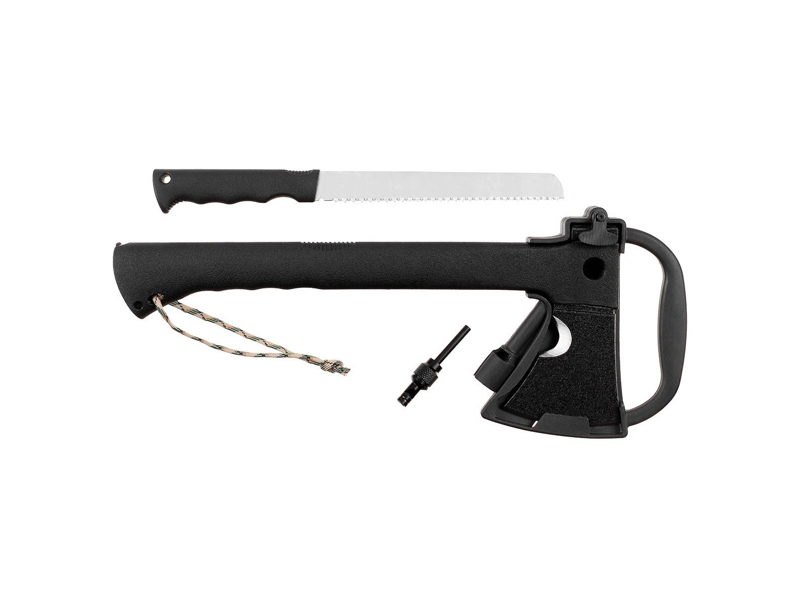 Specjalne wcięcie w głowicy umożliwia łatwe cięcie cienkich gałęzi, a tylna część toporka pełni funkcję młotka, co sprawia, że jest to wyjątkowo uniwersalne narzędzie terenowe. W zestawie znajduje się również piła z ząbkowanym ostrzem o długości 180 mm, zintegrowana z rękojeścią – gotowa do szybkiego użycia.