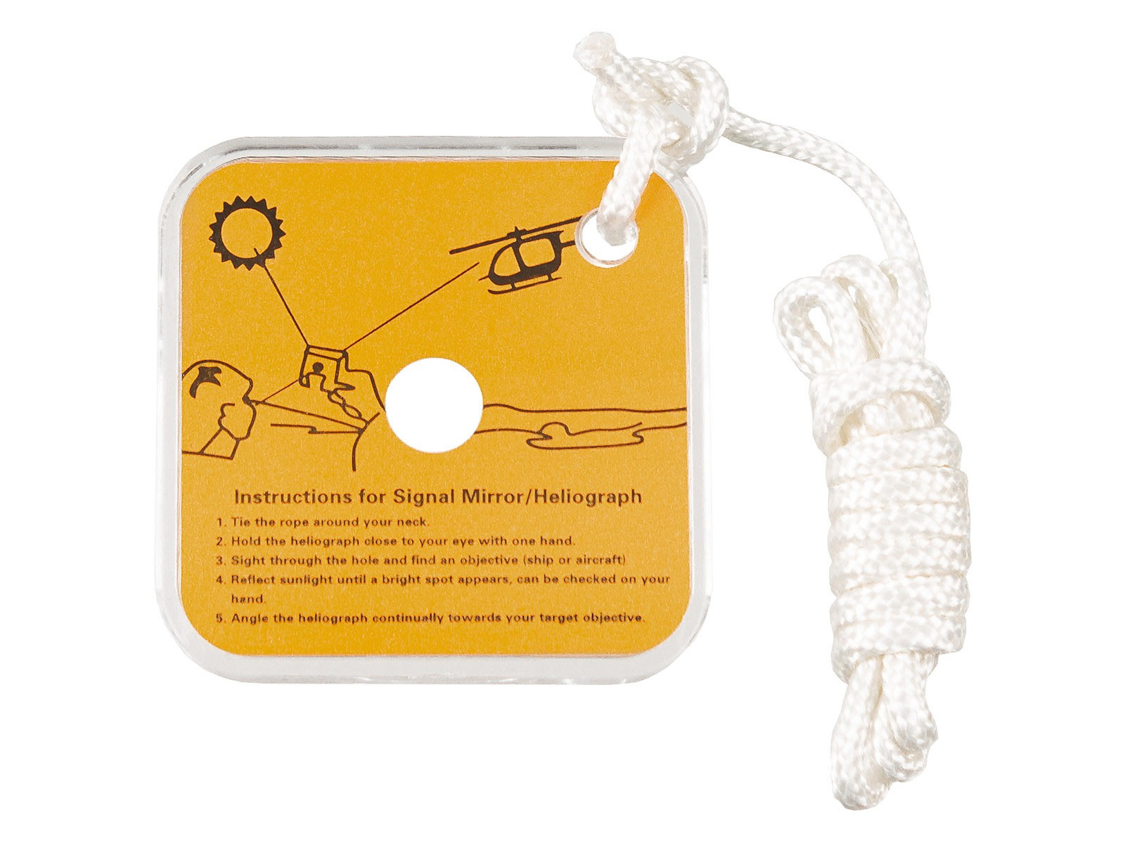 Na odwrocie lusterka znajduje się skrótowa instrukcja obsługi, a dołączona linka umożliwia zawieszenie heliografu na nadgarstku lub przytroczenie do wyposażenia – dzięki temu jest zawsze pod ręką, gdy go potrzebujesz.