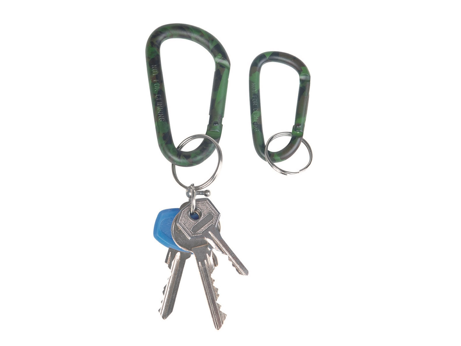 Aluminiowy karabińczyk w kamuflażu woodland, idealny do codziennego użytku w terenie. Sprawdzi się jako uchwyt do kluczy, mocowanie drobnego wyposażenia do plecaka, pasa lub torby.
