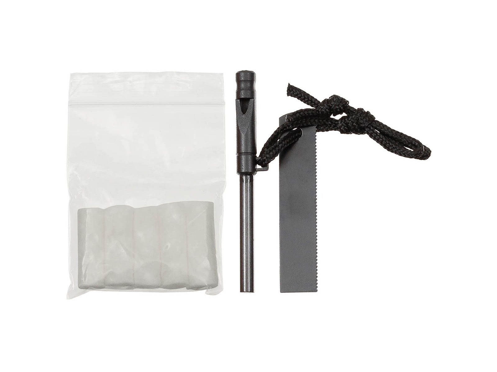 - W zestawie: 1 śpiwór, 1 krzesiwo z gwizdkiem i skrobakiem, 5 kawałków waty do rozpalania ognia,