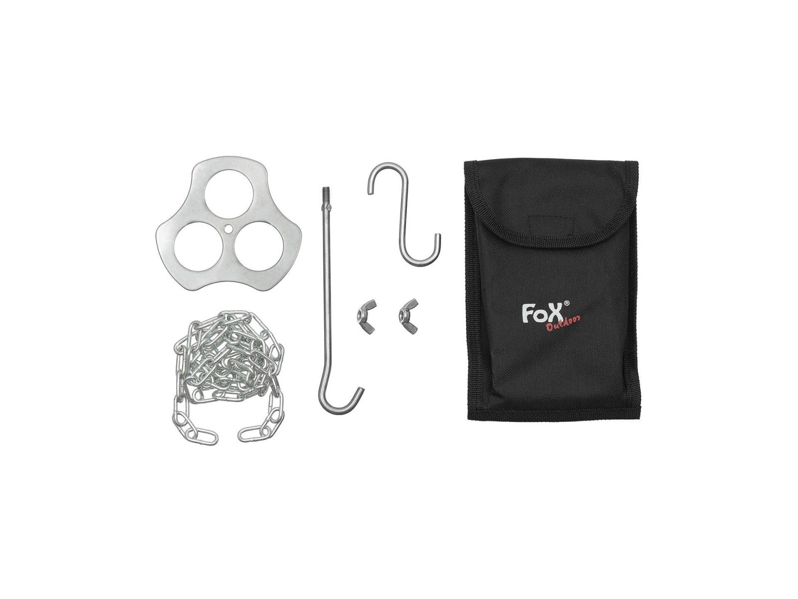 Kompaktowy uchwyt o wymiarach 10 x 10 cm zapewnia stabilność całej konstrukcji, a łańcuch o długości 100 cm daje dużą swobodę ustawienia naczyń na odpowiedniej wysokości. W zestawie znajduje się torba transportowa ze szlufką na pas, która ułatwia przenoszenie i przechowywanie zestawu w terenie.
